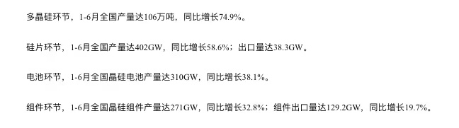 数据显示,今年上半年国内光伏产业各环节产量均继续保持高增长。多晶硅环节产量同比增长74.9%,硅片环节同比增长58.6%,电池环节同比增长38.1%,组件环节同比增长32.8%,各环节产量同比均增长超30%。