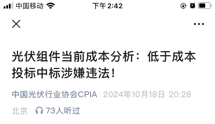 还有第三个传言,中国光伏行业协会呼吁不要“内卷”。10月18日协会官方公众号发布“光伏组件当前成本分析:低于成本投中标涉嫌违法”的文章指出,当前一体化企业N型M10双玻组件最终含税生产成本为0.68元/瓦,已是行业优秀企业在保证产品质量前提下的最低成本,并呼吁防止“内卷式”恶性竞争,不要进行低于成本的销售和竞标。