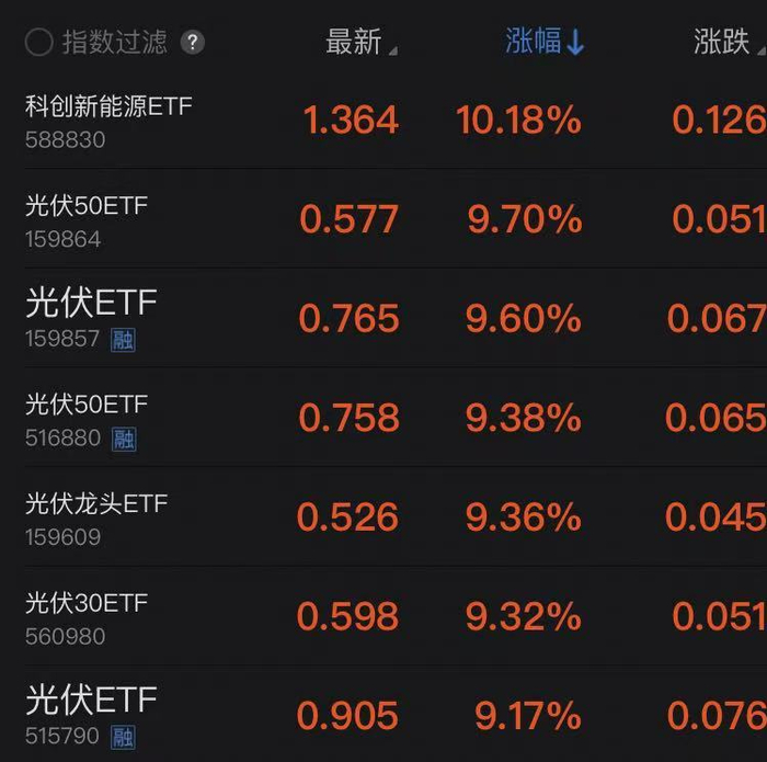 (隆基绿能股价走势截图)随着光伏板块龙头股的强势大涨,行业对应的ETF自然受益最大,10点40左右,科创板能源ETF已涨超8%,几只光伏ETF也大涨超7%,光伏相关ETF领涨全市场ETF。到收盘,科创能源ETF涨超10%,光伏ETF均涨超9%。