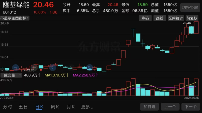 涨停板只有10%的里面,TCL中环、通威股份、福莱特,开盘仅十分钟后就已经封死涨停,千亿巨头隆基绿能也在10点半左右冲上涨停板位置,午后也封死涨停。