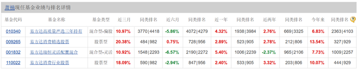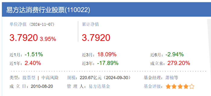 萧楠目前在管4只产品,总规模391.18亿。其中,规模最大的易方达消费行业股票,该基金最新规模220.67亿,近三个月收益率18.09%,在同类中排名靠后,跑输同期沪深300近6个百分点;其次是易方达高质量严选三年持有,该基金最新规模89.33亿,近三个月收益率仅为10.97%,在同类中排名3770,远远跑输同类产品表现,更是跑输同期沪深300指数超13个百分点;表现最好的是易方达消费精选股票,近三个月收益率20.38%,在同类产品中排名处于腰部,同样也跑输沪深300指数。