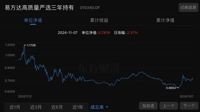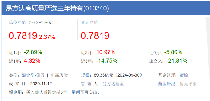 (易方达消费行业股票单位净值走势截图)其次是规模近90亿的易方达高质量严选三年持有,这只产品应该是基金持有人对基金经理萧楠意见最大的一只产品,因为这是一只封闭期长达三年的封闭基金,它成立于2020年11月12日,封闭期届满已经是2023年11月了,可那是该基金已经亏了超25%,期间最大回撤超37%,亏损超44.6亿。