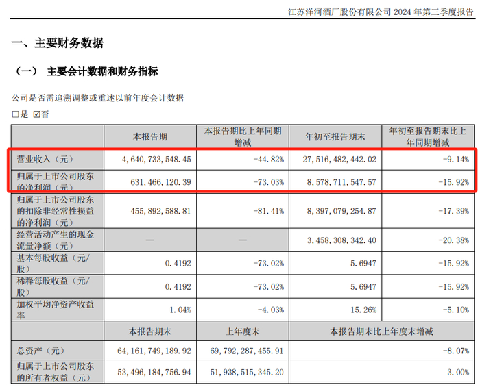 今年三季度,洋河股份营收46.41亿、同比大幅下滑44.82%,净利润6.31亿、同比暴跌73.03%。