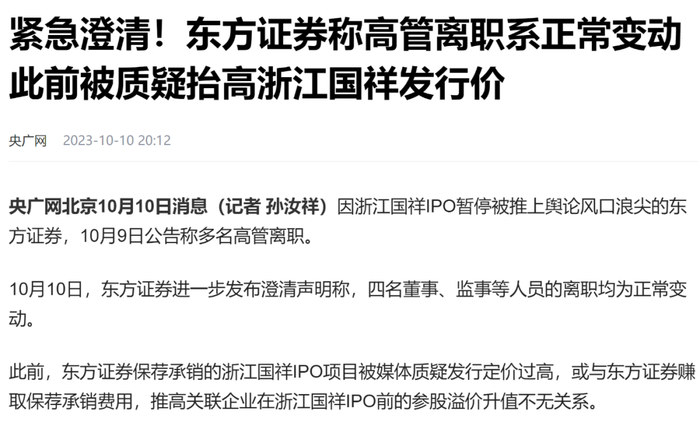 高管当时为何集体辞职?市场普遍认为跟浙江国祥IPO事件有关,不过东方证券却说这是正常人事变动。