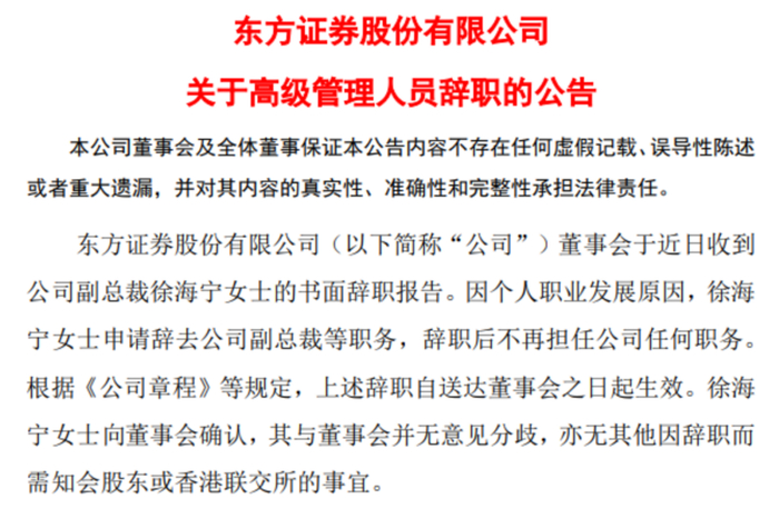 11月20日,证券行业再曝大消息,东方证券副总裁徐海宁因个人原因辞职。