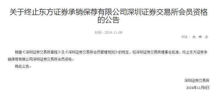 紧接着,11月8日,深交所发布关于终止东方证券承销保荐有限公司深圳证券交易所会员资格的公告。