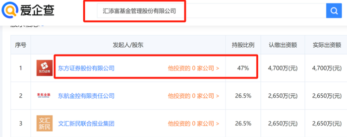 汇添富基金是国内著名公募基金,东方证券正是其第一大股东,持股比例高达47%。