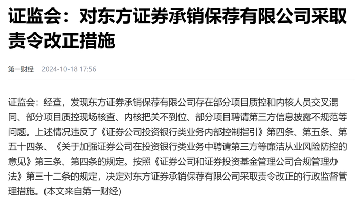 2024年10月18日,证监会发布消息,对东方证券承销保荐有限公司采取责令整改措施,原因是其存在部分项目质控和内核人员交叉混同、部分项目质控现场核查、内核把关不到位、部分项目聘请第三方信息披露不规范等问题。