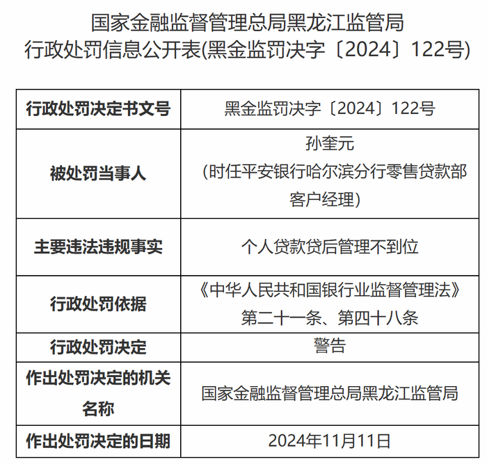到前两天,11月18日,国家金融监管总局网站信息又显示,因个人贷款贷后管理不到位,多位平安银行哈尔滨分行零售贷款部客户经理以及普惠金融业务部普惠金融部一部团队长被国家金融监管总局黑龙江监管局处以警告处罚。