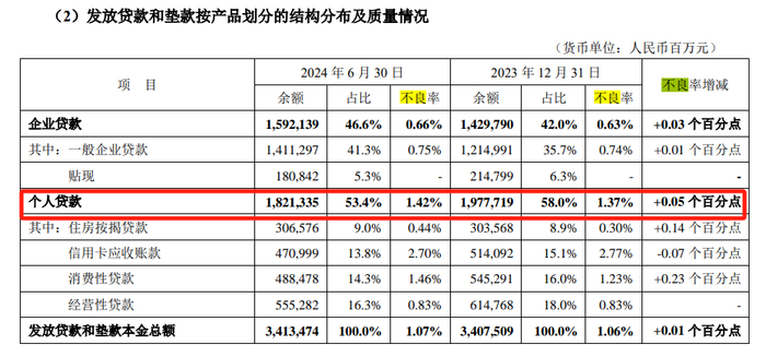 (平安银行半年报截图)与此同时,平安银行的不良率却在上升。截至2024年6月末,平安银行不良贷款率1.07%,较上年同期上升0.01个百分点。其中,个人贷款不良率1.42%,这里面最高的就是信用卡应收账款,不良率达到2.7%,但较去年底已经有所下降。