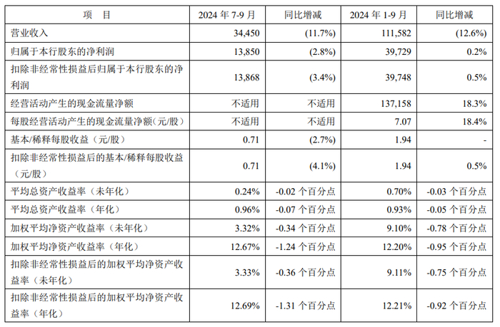 平安银行今年三季报显示,第三季度,营收344.5亿、同比下滑11.7%,净利润138.5亿、同比下滑2.8%。前三季度,营收1115.82亿、同比下滑12.6%,净利润397.29亿、同比微增0.2%。除此之外,平安银行的总资产收益率、净资产收益率全部都在下滑。