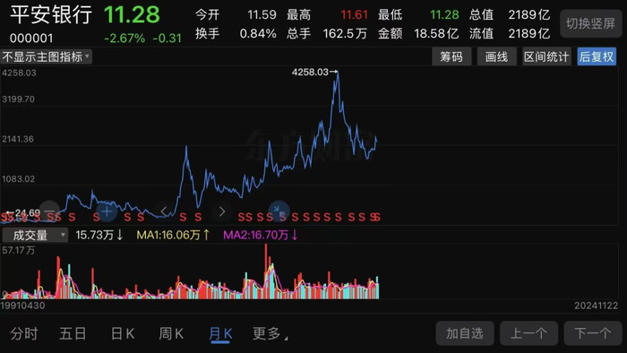 (平安银行股价走势截图)需要说明的是,此处选择后复权价格,是因为银行股以高股息著称,平安银行合并前后股价前复权后,90年代的股价基本就是负值,不便于计算涨幅。
