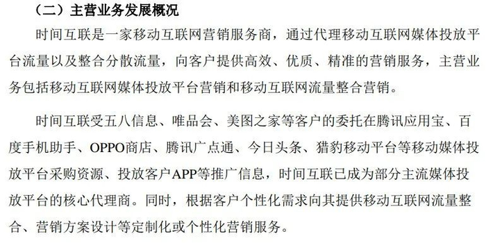 时间互联是一家移动互联网营销服务商,通过代理移动互联网媒体投放平台流量以及整合分散流量,向客户提供高效、优质、精准的营销服务,其代理的平台流量几乎涵盖所有主流互联网平台流量。