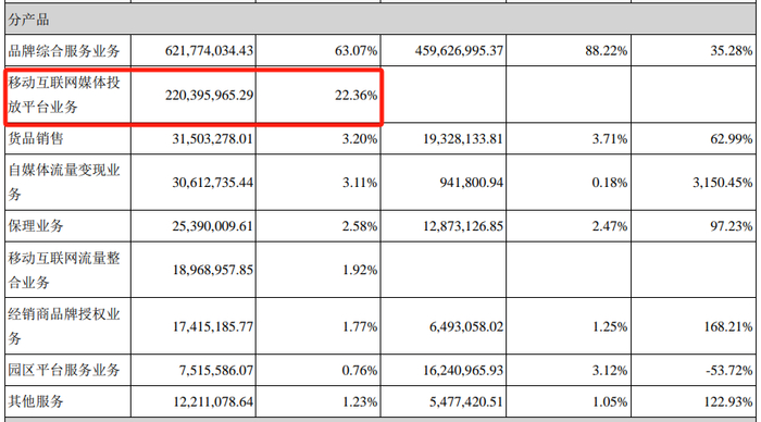 (南极电商2017年财报截图)与此同时,南极电商也在2017年的年报中首次增加“移动互联网媒体投放平台业务”,当年品牌综合服务业务营收占比还高达63.07%,而新增的移动互联网媒体投放平台业务收入占比只有22.36%。