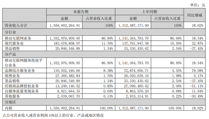 今年上半年,南极电商实现总营收15.57亿,其中移动互联网媒体投放平台业务营收13.53亿、占比为86.9%,品牌综合服务业务营收1.3亿、占比为8.38%,经销商品牌授权业务营收只有1324.91万、占比仅为0.64%。