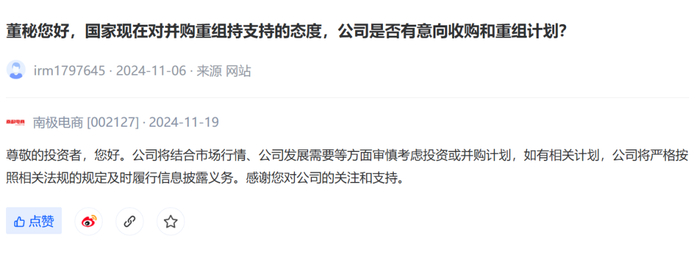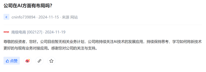 11月19日,南极电商在互动平台回复投资者提出的“公司是否有意向收购和重组计划?”的问题时表示,“公司将结合市场行情、公司发展需要等方面审慎考虑投资或并购计划”。在回复投资者提出的“公司在AI方面有布局吗?”的问题时,表示“公司目前暂无相关业务计划。公司将持续关注AI技术的发展应用,持续保持思考、学习如何将新技术更好地与现有业务对接应用”。