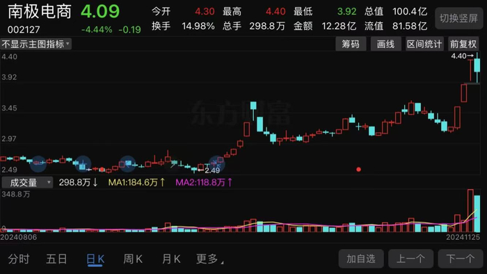 过去3个月A股整体表现较好,“吊牌大王”南极电商的股价也“崛地而起”,从今年8月底的最低2.49元上涨到4.4元,涨幅超76%,虽然还没有翻倍但较市场整体表现还是要强不少。