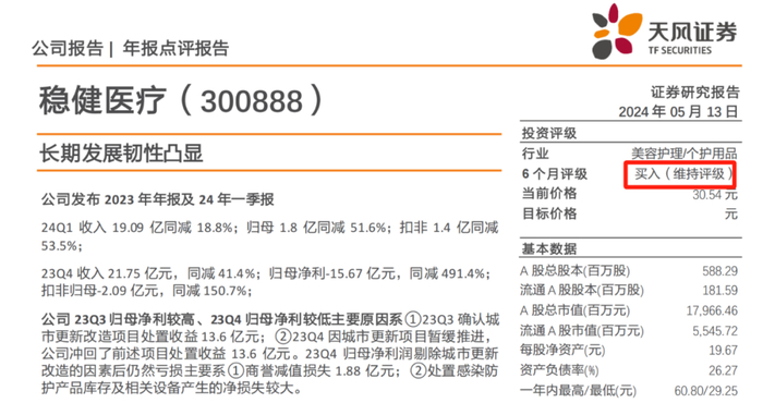 天风证券对稳健医疗的评级也挺搞笑的。2024年5月13日发表买入(维持评级)研报,称公司长期发展韧性凸显。当时稳健医疗股价在30元附近,此研报发布之后股价继续一路下跌,且呈现加速下跌趋势,在8月23日跌到了最低的22.91元,比研报发布时跌了20%多。