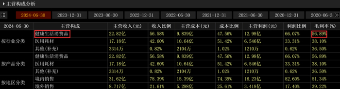 同期,稳健医疗的健康生活消费品毛利率也在57%左右,明显高过公司医用耗材产品38%的毛利率。