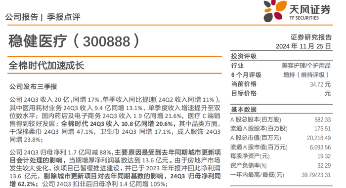 这份报告还特意夸了一下全棉时代,称全棉时代二季度营收同比增长13.8%,三季度营收同比增长20.6%,同比增速提升为公司贡献了较大业绩增长动力,体现了公司坚持传递品牌价值的初心,市场对全棉时代品牌和核心爆品的认可度还在持续提升等。