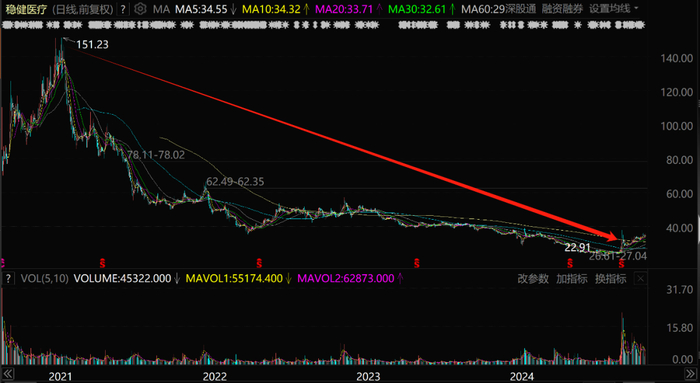 稳健医疗是2020年上市,股价2021年年初一度涨到150元以上,但之后的几年就成了一路下跌的趋势,在今年9月底大盘上涨之前,一度跌到23元以下,较高点暴跌85%。