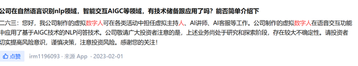 股票名称全为数字的二六三,在2023年初就推出了虚拟数字人产品。二六三曾在互动平台表示:“公司制作的虚拟数字人在语音交互功能中应用了基于AIGC技术的NLP问答技术”。