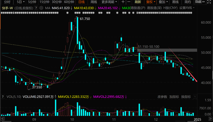 11月20日,快手三季报公布后连续大跌两天,此后股价连续震荡。12月10日之后,快手又陷入到新一轮股价下跌中,从50港元附近跌到了目前的40港元附近,不到一个月下跌20%。