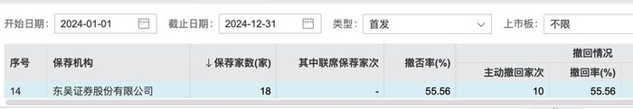 据wind数据显示,2024年东吴证券保荐项目有18家,但主动撤回的就有10家,撤回率高达55.56%。
