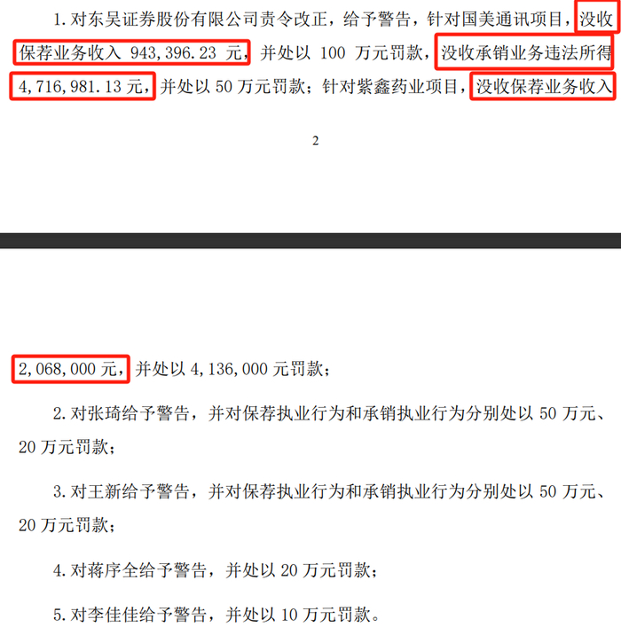 (东吴证券公告截图)与此同时,证监会对东吴证券在国美通讯2020年非公开发行、紫鑫药业2014年非公开发行中涉及的相关责任人分别作出10万、20万、50万不等的罚款处罚。