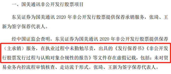 经查明,东吴证券在国美通讯2020年非公开发行保荐项目中未勤勉尽责,出具的《发行保荐书》《非公开发行股票发行过程与认购对象合规性的报告》等文件存在虚假记载。没收国美通讯项目的保荐业务收入94.34万元并处100万元罚款,没收承销业务违法所得471.69万元并处50万元罚款。