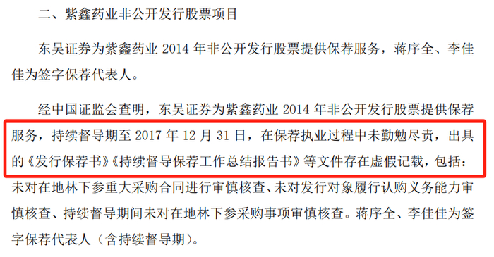 (东吴证券公告截图)经查明,东吴证券在紫鑫药业2014年非公开发行保荐项目中未勤勉尽责,出具的《发行保荐书》《持续督导保荐工作总结报告书》等文件存在虚假记载。没收保荐业务收入206.8万元并处413.6万元罚款。