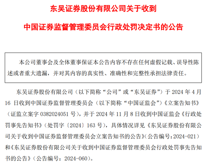 (东吴证券公告截图)2024年11月9日,证监会对东吴证券下达行政处罚事先告知书。