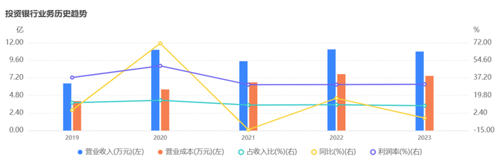 过去几年,东吴证券的投行业务收入规模基本稳定在10亿左右,最高时2022年达到11.08亿,最低是2019年6.4亿,然后是2021年从2020年的11亿下滑至9.47亿,规模变动实际并不大,但这项业务占东吴证券整体营收的比重却从2020年的14.99%降至2023年的9.56%,2024年上半年的占比又降至7.21%。