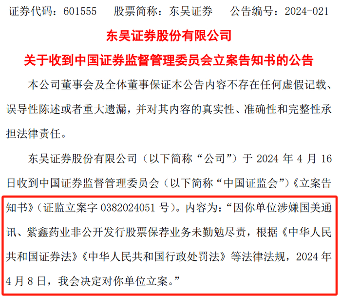 2024年4月17日东吴证券公告,因涉嫌国美通讯、紫鑫药业非公开发行股票保荐业务未勤勉尽责被立案调查。