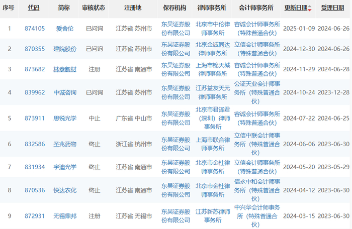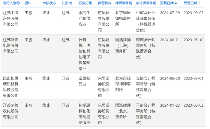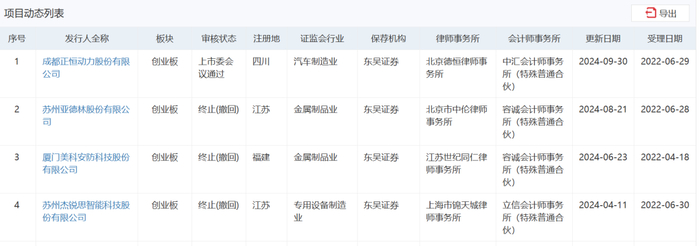 (数据来源:wind)2024年东吴证券保荐的深交所IPO项目,4个项目就有3个因撤回而终止。东吴证券保荐的上交所的IPO项目更是全军覆没,4个项目4个撤回终止。东吴证券保荐的北交所的IPO项目情况要稍微好一点,2024年保荐了9个北交所IPO项目,目前已有2个成功上市,但有3个终止、1个中止。