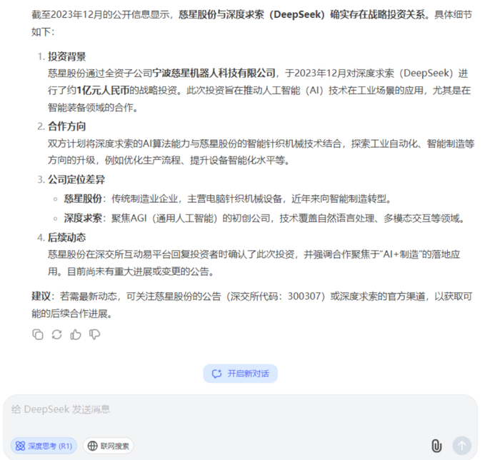 当用DeepSeek搜索慈星股份有关信息时,显示慈星股份通过旗下子公司对DeepSeek进行了1亿元战略投资。