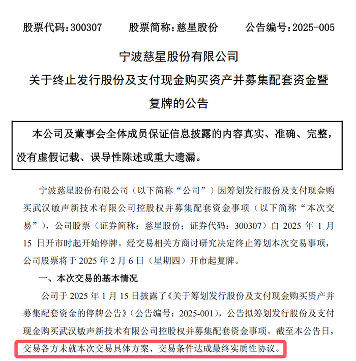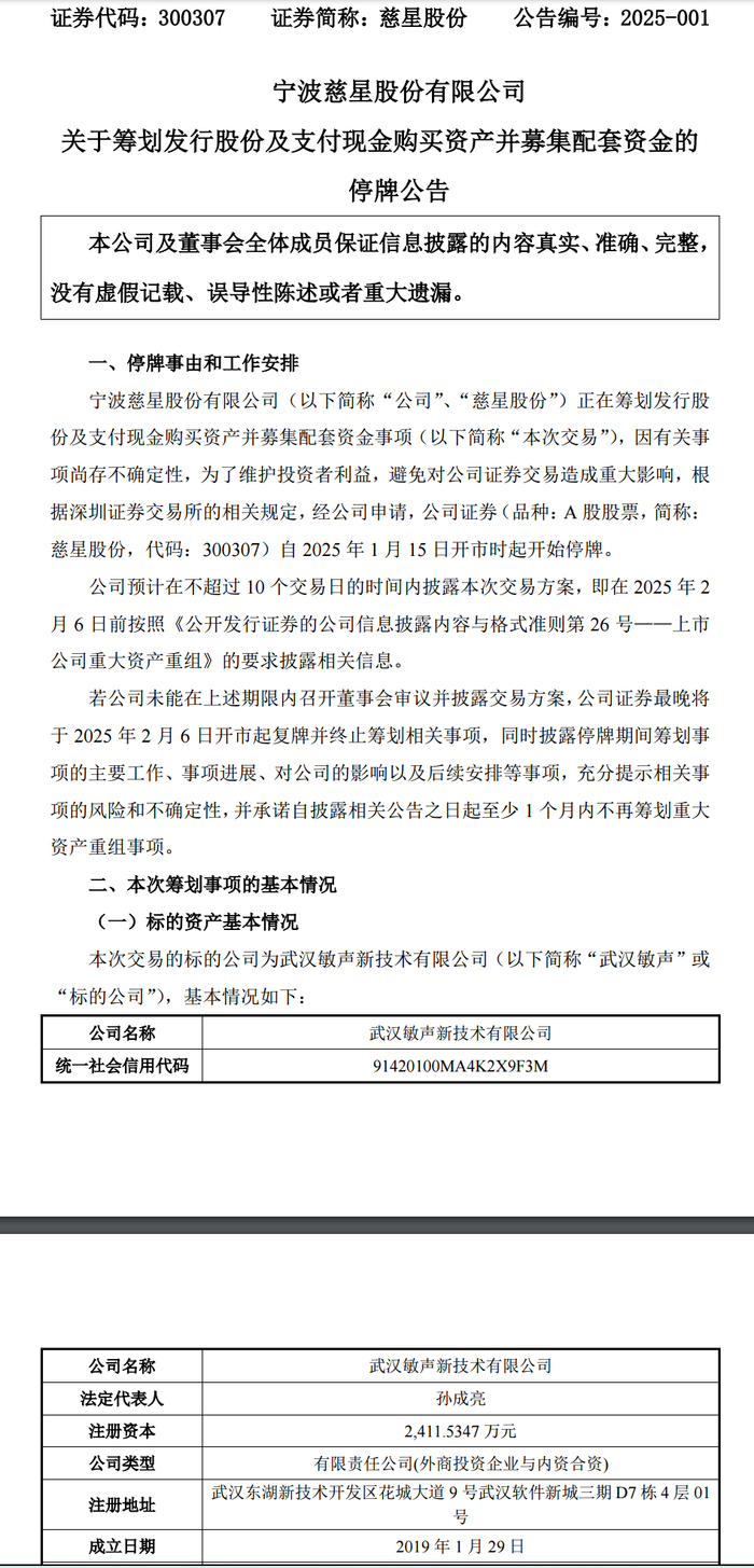 1月14日收盘后,慈星股份发布公告,因筹划收购事项停牌,收购对象是武汉敏声。