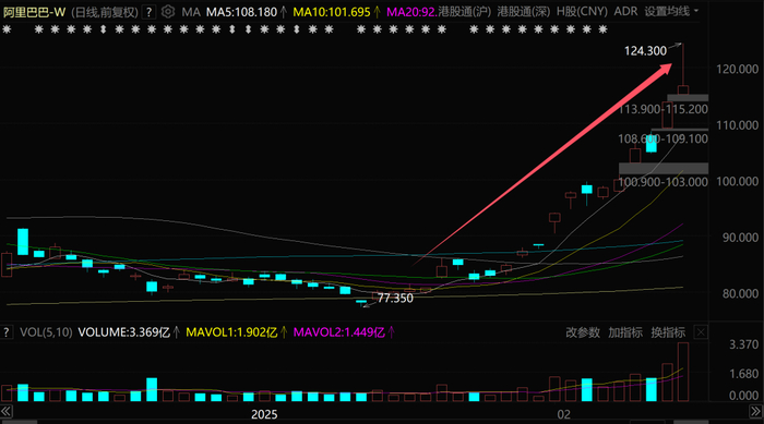 从1月13日至今,港股阿里巴巴股价从78港元暴涨到120港元以上,涨幅超过50%;美股阿里巴巴股价从80美元涨到120美元附近,涨幅50%。