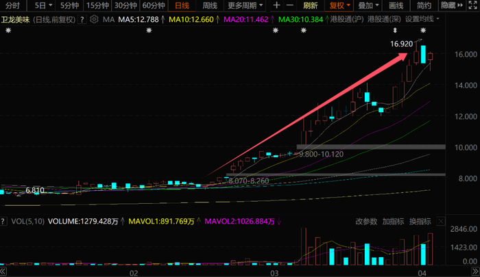 2月中旬以来,卫龙美味从7.2港元附近一口气暴涨到16.8港元,一个多月暴涨133%!