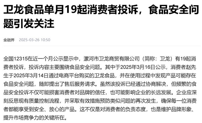 作为食品类公司,最重要的是食品安全。虽然卫龙屡次强调食品安全,在构建全链条食品安全防线,但近期依然有多起被消费者投诉的情况。