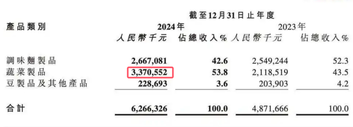 而以魔芋爽为代表的蔬菜制品,2024年营收33.7亿元,比2023年的21.18亿元大增59%,一举反超调味面制品的营收,占公司总营收的53.8%,成为最大营收来源。