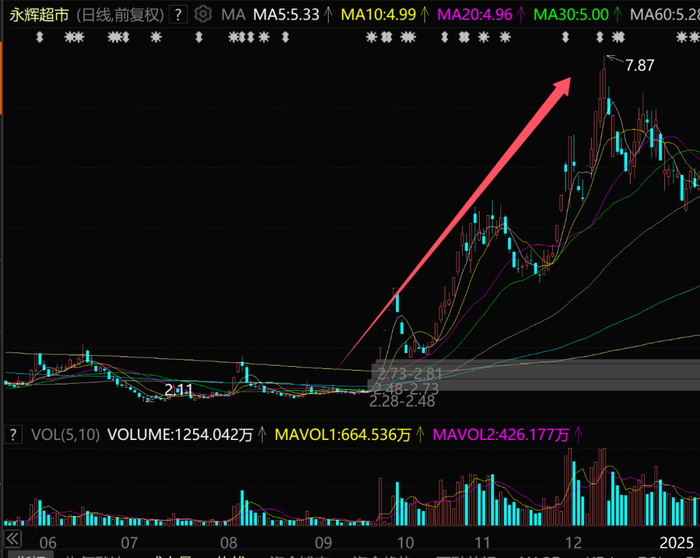 这直接带飞了永辉超市的股价,2024年9月-12月,永辉超市从2.2元涨至7.87元,涨幅超过250%!
