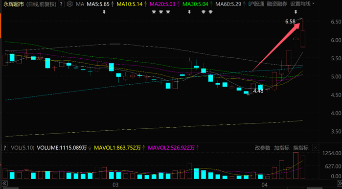 4月3日、8日,永辉超市股价均出现涨停,4月10日盘中一度大涨近9%,不过收盘回落到上涨3%左右。