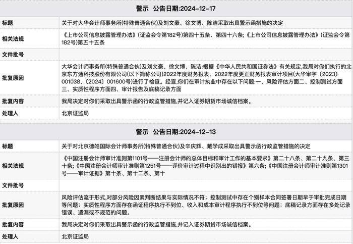 2024年4月29日,北京证监局对东方通2022年财报信息披露不准确行为下发整改通知,次日(2024年4月30日)收到北京证监局行政处罚决定。2024年12月13日,审计机构北京德皓国际会计师事务所及相关人员被出具警示函。2024年12月17日,审计机构大华会计师事务所及相关人员被出具警示函。