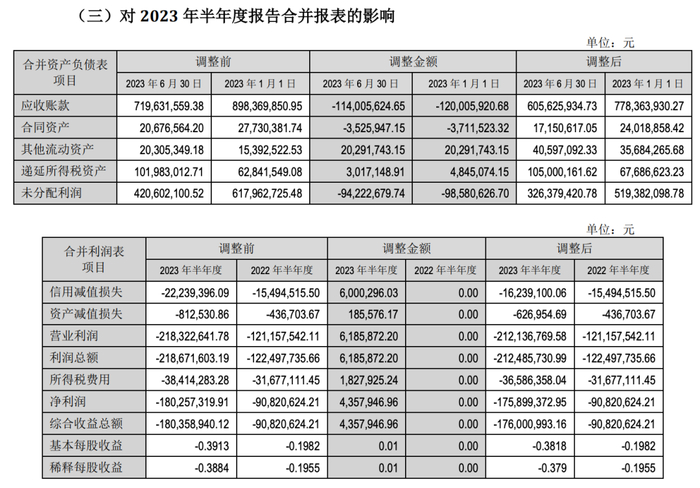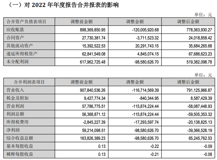 2022年财报,调整后应收账款减少1.2亿、未分配利润减少9858.06万、营业收入减少1.17亿、营业利润减少1.16亿、净利润减少9858.06万。2023年半年报,应收账款调减超1.14亿、未分配利润调减超9422.26万,利润表相关科目又有不同程度的调增。