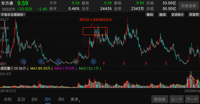 (东方通招股书截图)自这一家子违规套现之后,东方通股价基本就是一路下跌的趋势,2020年初东方通股价最高是37.74元,2024年7月底曾一度跌至7.26元的低点,较前实控人违规减持期间的高点暴跌超80%,今天收盘9.59元的股价较那时也跌了75%。