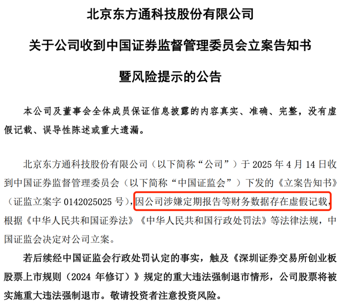 4月14日,东方通公告,因公司涉嫌定期报告等财务数据存在虚假记载被立案调查,若后续经证监会行政处罚认定的事实,触及重大违法强制退市情形,公司股票将被实施重大违法强制退市。
