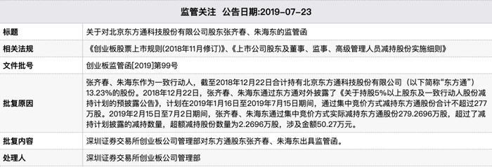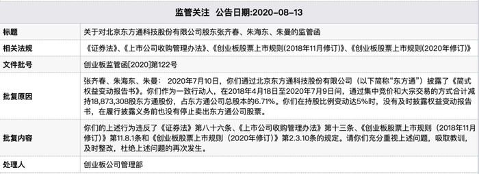 2020年8月13日,深交所向东方通下达的监管函显示,在2018年4月18日至2020年7月9日期间,张齐春、朱海东、朱曼通过集中竞价和大宗交易的方式合计减持1887.33万股东方通股份,占东方通总股本的6.71%,但在减持达5%时没有及时披露权益变动,也没有停止卖出东方通股票,违反了相关规定。