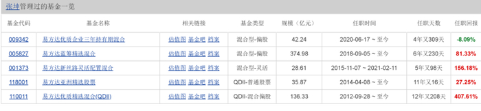 目前,张坤掌管的基金有4只,分别是易方达蓝筹精选混合、易方达优质精选混合、易方达优质企业三年持有期混合、易方达亚洲精选混合。