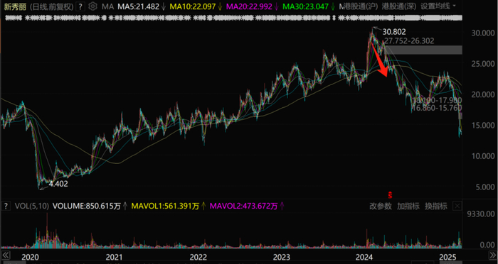 2025年2月之后,恒生指数继续节节攀升,新秀丽股价却率先掉头向下,从23港元附近一度跌到13港元以下,跌幅高达45%!